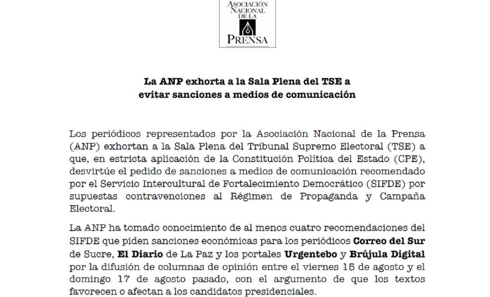 Los periódicos representados por la Asociación Nacional de la Prensa (ANP) exhortan a la Sala Plena del Tribunal Supremo Electoral (TSE) a que, en estricta aplicación de la Constitución Política del Estado (CPE), desvirtúe el pedido de sanciones a medios de comunicación recomendado por el Servicio Intercultural de Fortalecimiento Democrático (SIFDE) por supuestas contravenciones al Régimen de Propaganda y Campaña Electoral.