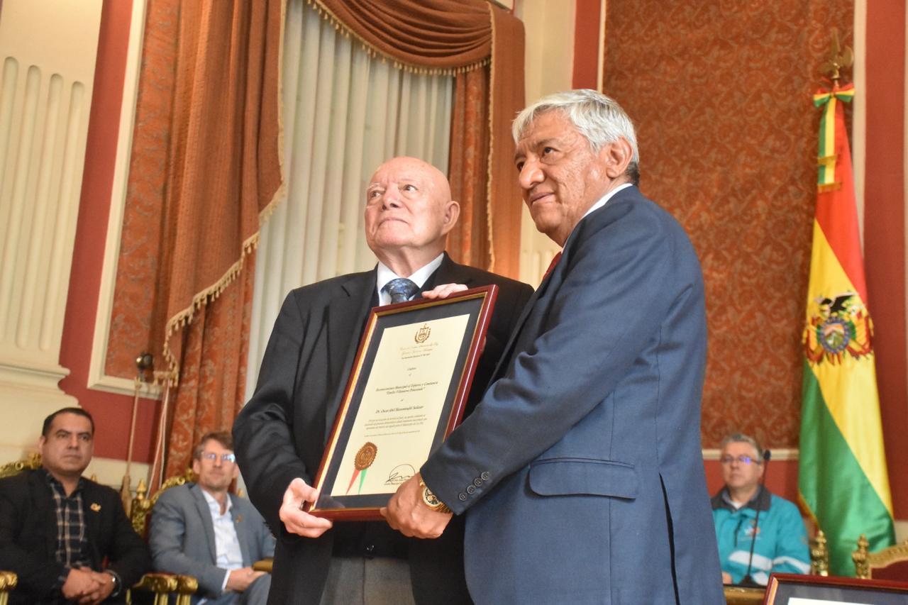 Como una muestra de reconocimiento el proceso que lideró al organizar las elecciones generales del pasado 17 de agosto, en el marco de la transparencia, compromiso institucional y con resultados altamente satisfactorios, el alcalde Iván Arias entregó este martes el Reconocimiento Emilio Villanueva Peñaranda al presidente del Tribunal Supremo Electoral (TSE), Óscar Hassenteufel y el Reconocimiento Municipal al vocal Gustavo Ávila por ser el responsable del Sistema de Resultados Preliminares (Sirepre).