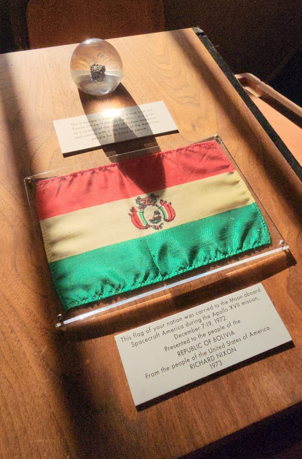 “A cada país le dan su bandera que llegó a la Luna, más un pedacito de la Luna. Es muy pequeñito, pero el que tenemos se ve grande porque está encapsulado en un acrílico que, por su geometría, aumenta mucho su tamaño”, explicó Rubbert Muñoz, técnico del Observatorio Astronómico y Planetario Max Schreier de la UMSA.